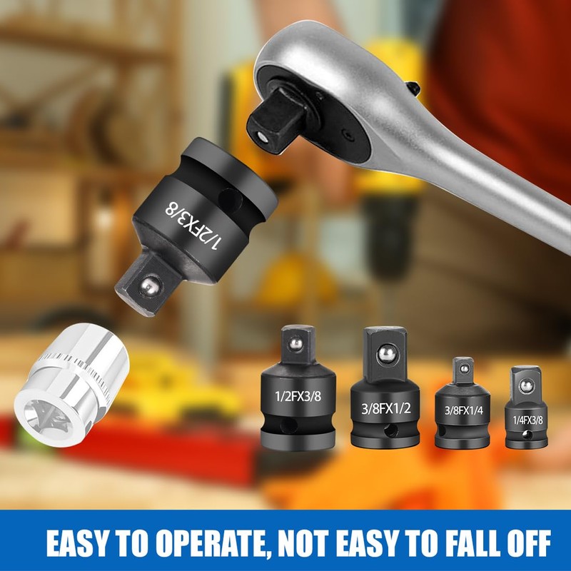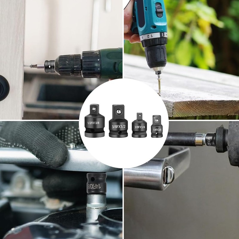 - Universal: the impact wrench adapter and the reducer set include 1/4 inch (F)-3/8 inch (M), 3/8 inch (F)-1/4 inch (M), 3/8 inch (F)-1/2 inch (M), 1/2 inch (F)-3/8 inch (M), total 4 pieces. Seamless change between drive sizes 1/4 inch, 3/8 inch and 1/2 inch