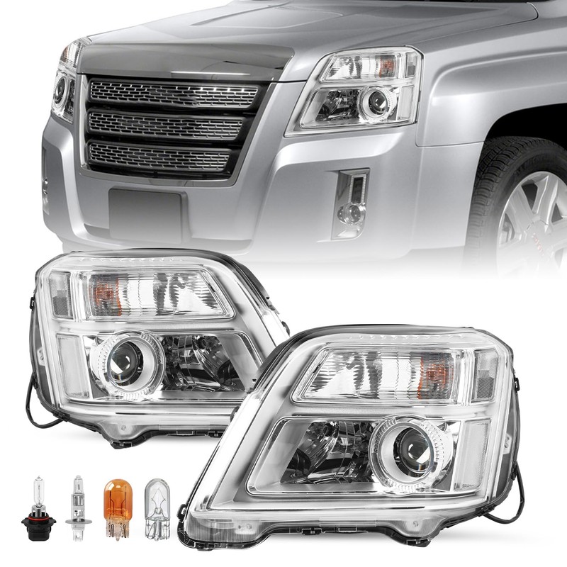 - 🚗【FITMENT】Headlights Assembly fit for 2010 2011 2012 2013 2014 2015 GMC Terrain SUV SL SLE SLT Halogen Type 2-Door Regular Cab | 4-Door Extended Cab | 4-Door Crew Cab | 4-Door Sport Utility. Compatible with models with halogen headlights ONLY. Not compatible with factory HID models. High beam bulb type: 9005(Included); Low beam bulb type: H1(Included);Signal light:7444NA(Included);Side Marker Light:168(Included). OEM PARTS NUMER:GM2503350, 23319180.