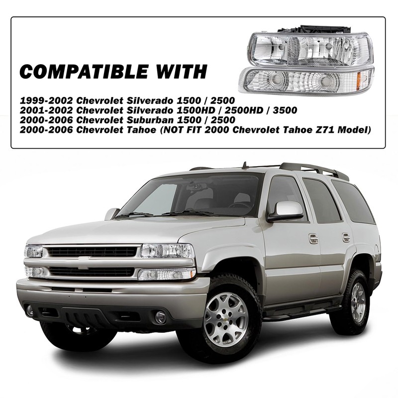 - 【FITMENT】Headlights Assembly Compatible with 1999-2002 Chevy Silverado 1500 / 2500, 2001-2002 Chevy Silverado 1500HD / 2500HD / 3500, 2000-2006 Chevy Suburban 1500 / 2500, 2000-2006 Chevy Tahoe (NOT FIT 2000 Chevrolet Tahoe Z71 Model). Bulbs are not included. High Beam: 9005; Low Beam: 9006; Signal Light: 3157A; Side Marker Light: 194NA; DRL: 4114. OEM Part Number: 16526133, 16526130, 15199558, 15199559. Partslink Number: GM2502187, GM2503187.