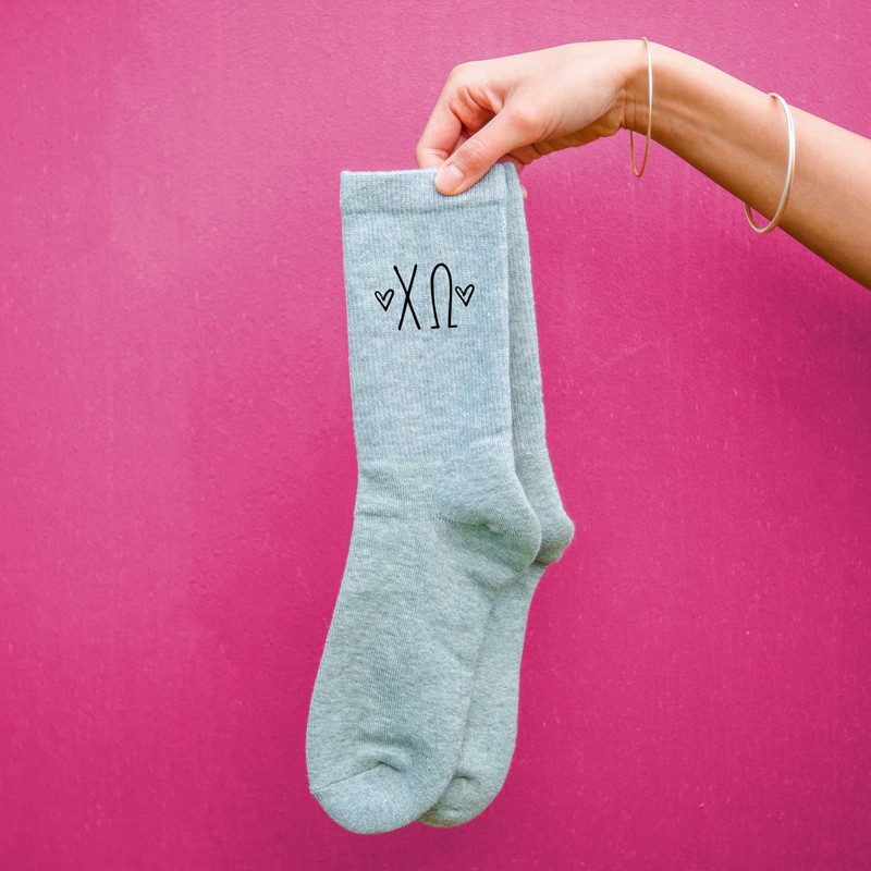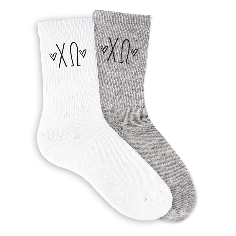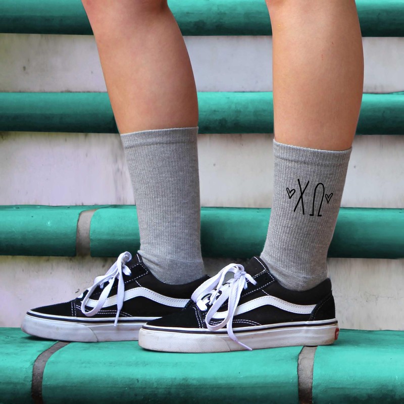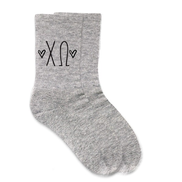 sockprints Chi Omega - Sorority Greek Letters with Hearts - Heather Gray Crew Socks