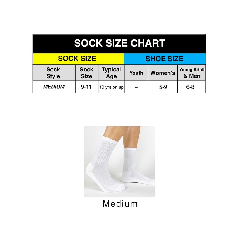 - Our socks are a soft cotton blend, ribbed 1/2 cushion crew sock and available in the women's standard sock size 9-11 which fits a shoe size 6-9. Machine wash warm inside out, tumble dry, do not use bleach.