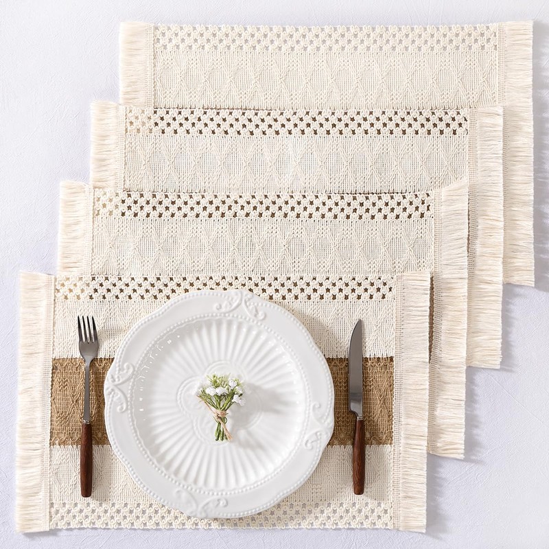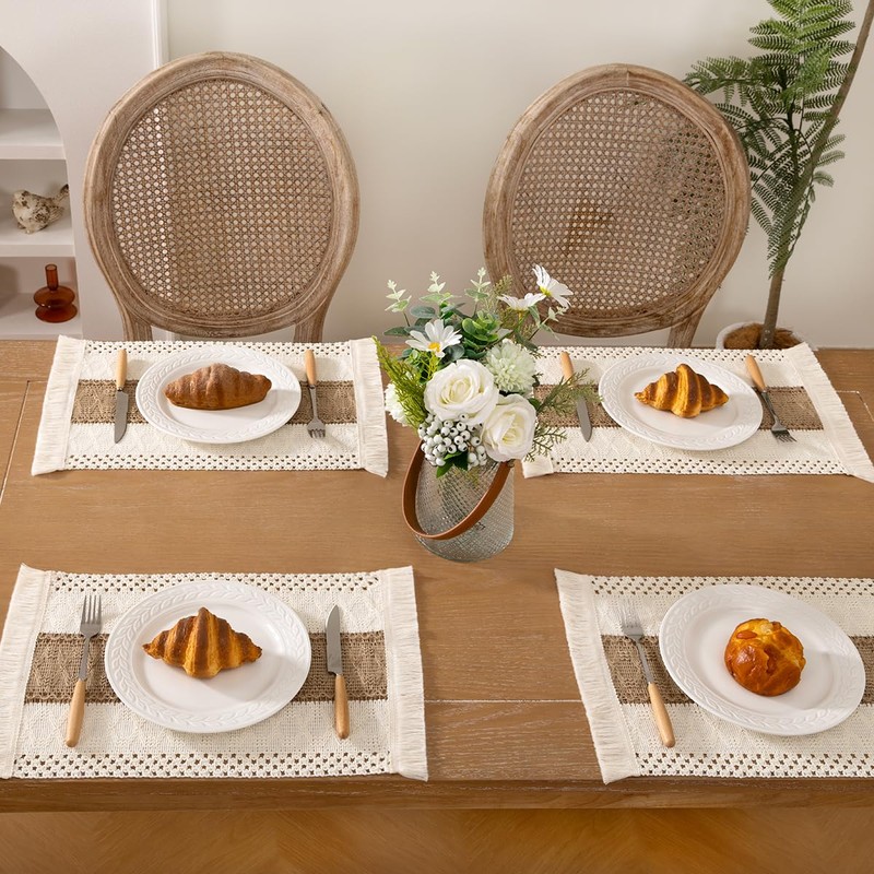 Socomi Boho Placemats Set of 4 Washable Cotton Burlap Farmhouse Table Mats Macrame Woven Dinner Table Decor Centerpiece for Party Home Decor