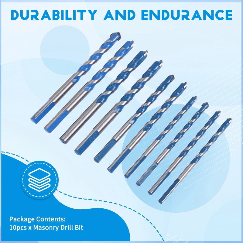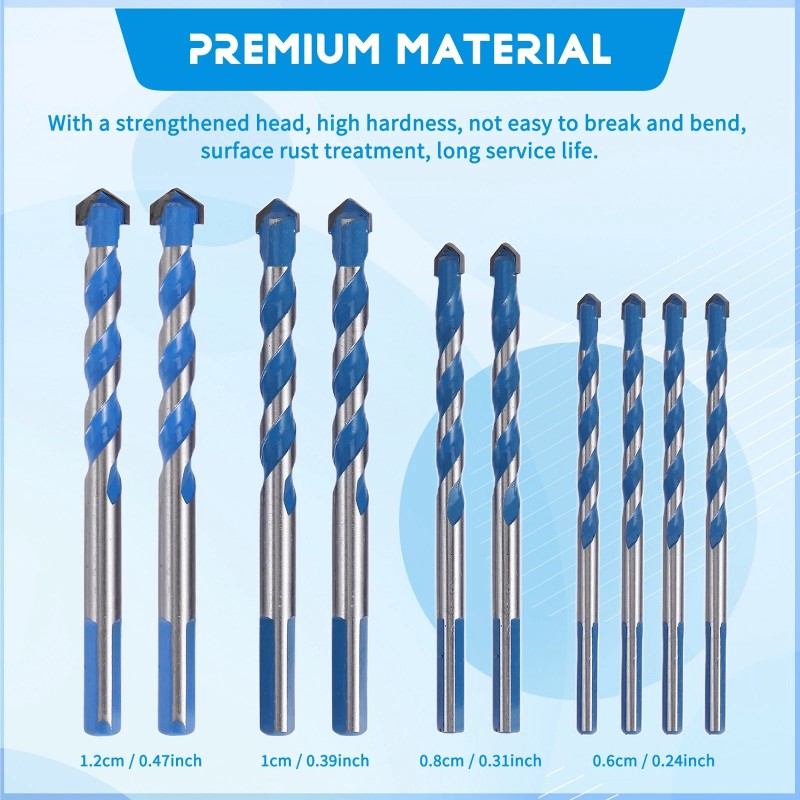 4 Size: Masonry drill bit with 4 different sizes, 4x 6mm(1/4 inch), 2x 8mm(5/16 inch), 2x 10mm(3/8 inch), 2x 12mm(1/2 inch) sizes for different use