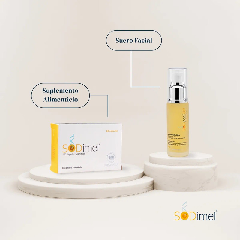 Sodimel es un potente suplemento antioxidante y antienvejecimiento, formulado científicamente con Superóxido Dismutasa (SOD), un poderoso neutralizador de radicales libres, en sinergia con aminoácidos esenciales y ceramidas que fortalecen la estructura celular de la piel desde el interior.