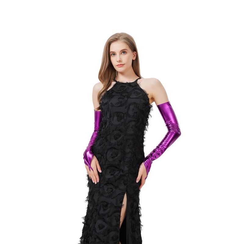 - [Ideal for Costumes and Cosplay] Complete your Halloween costume or cosplay with these stunning long purple fingerless gloves. Their shiny metallic appearance enhances any character, making them perfect for role-playing, photo shoots, or theatrical performances. With our purple metallic gloves, you’ll fully embody your character and stand out in any setting.