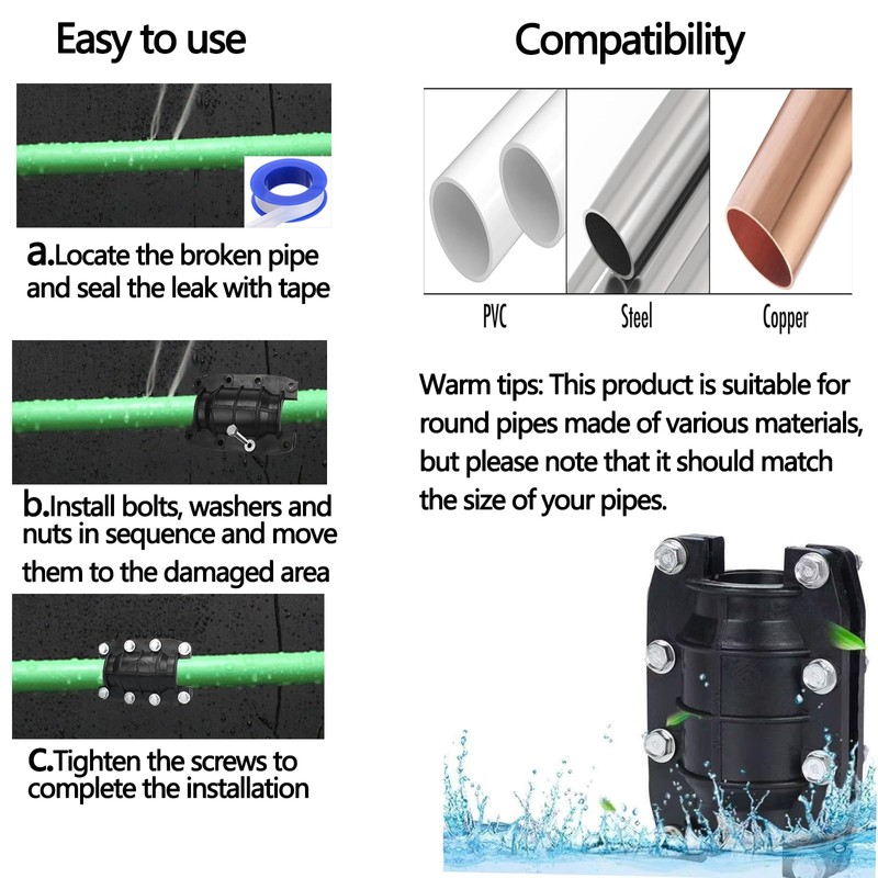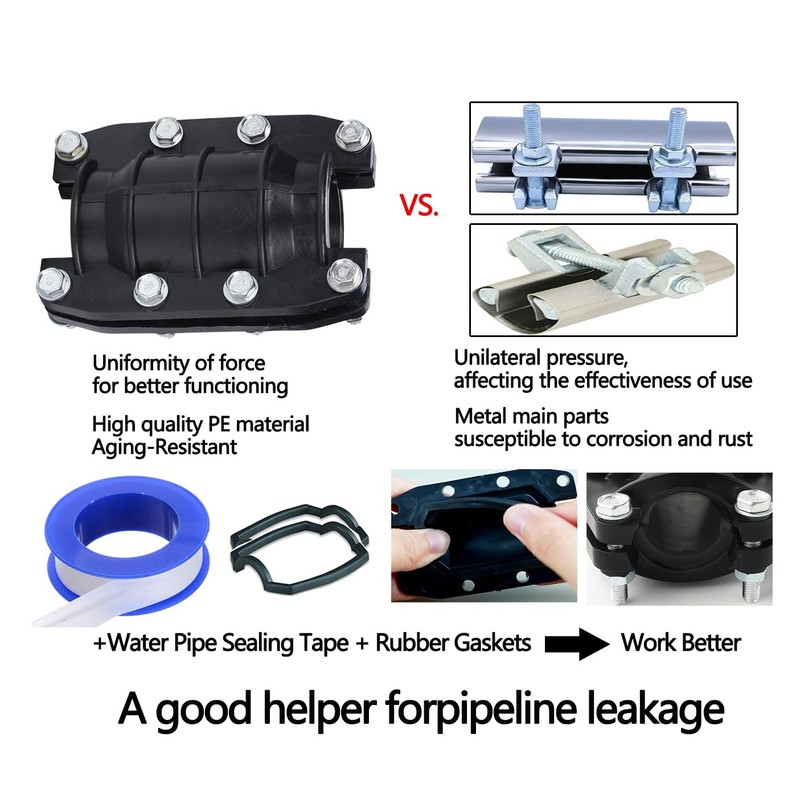 - HIGH QUALITY MATERIAL: The pipe repair clamp is made of high quality PE material, which is impact-resistant, crack-resistant, aging-resistant, affordable, and can stop leaks very well. You can use it with confidence.