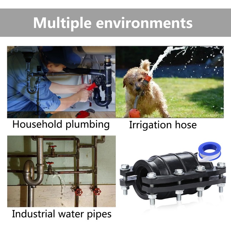 Packing List:1 Water Pipe Sealing Tape,2 Piece Pipe Repair Clamp,2 Rubber Gaskets,8 T-Bolts,8 Nuts,16 Washers