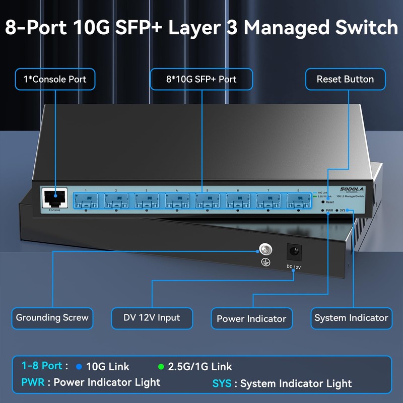 SODOLA 8 Port 10G SFP+ 8 x 10Gbps Managed Switch L3 Link Aggregation VLAN QoS ACL IGMP No Fan Silent Bandwidth 160Gbps Wall Mount