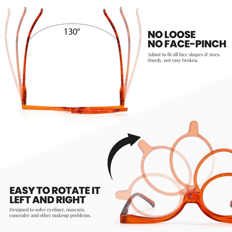 - One Eye Rotating Magnification: These makeup reading glasses feature a unique one-eye rotating magnification lens. This design allows you to easily switch between normal and magnified vision, making it perfect for precise makeup application and other detailed tasks.