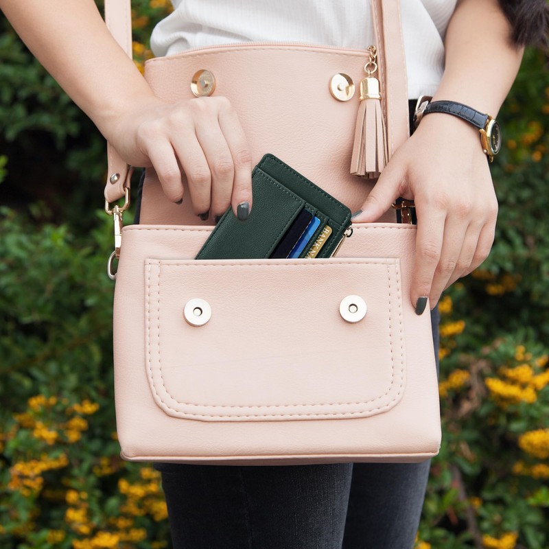 Sodsay Card Case Slim Front Pocket Wallet for Women Credit Card Holder with Keychain, Smooth Green Coal, one size, Minimalist