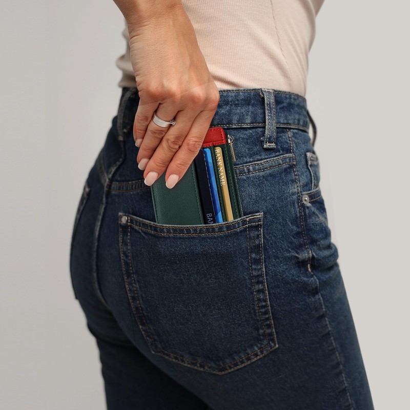 - Size: 4.4"*3.38". It's compact, super thin, ultra slim and and fits well in the front pocket