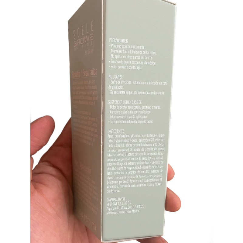 BLOOM BROWS Suero para cejas El suero para cejas SOÉLE BLOOM BROWS esta formulado con ingredientes selectos para el desarrollo de cejas fuertes, abundantes y seductoras. La fórmula SOÉLE BLOOM para cejas contiene aceites de semillas de amaranto, avena, quinoa y arroz, complejo de aminoácidos minerales, al 5% extracto de algas, l-arginina, pantenol y vitamina E. Resultados visibles a las 4 y 8 semanas de uso.