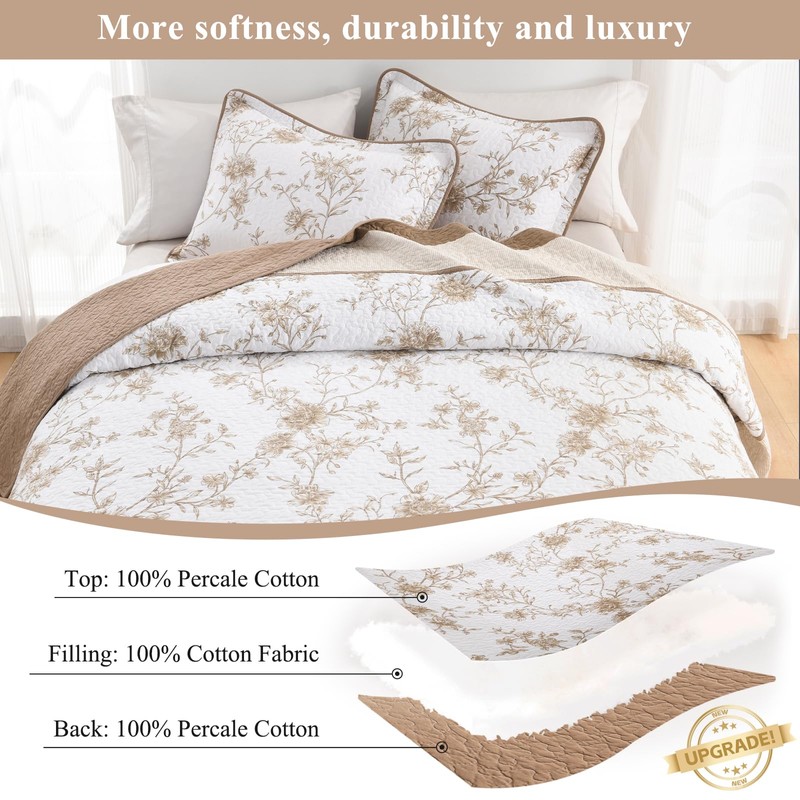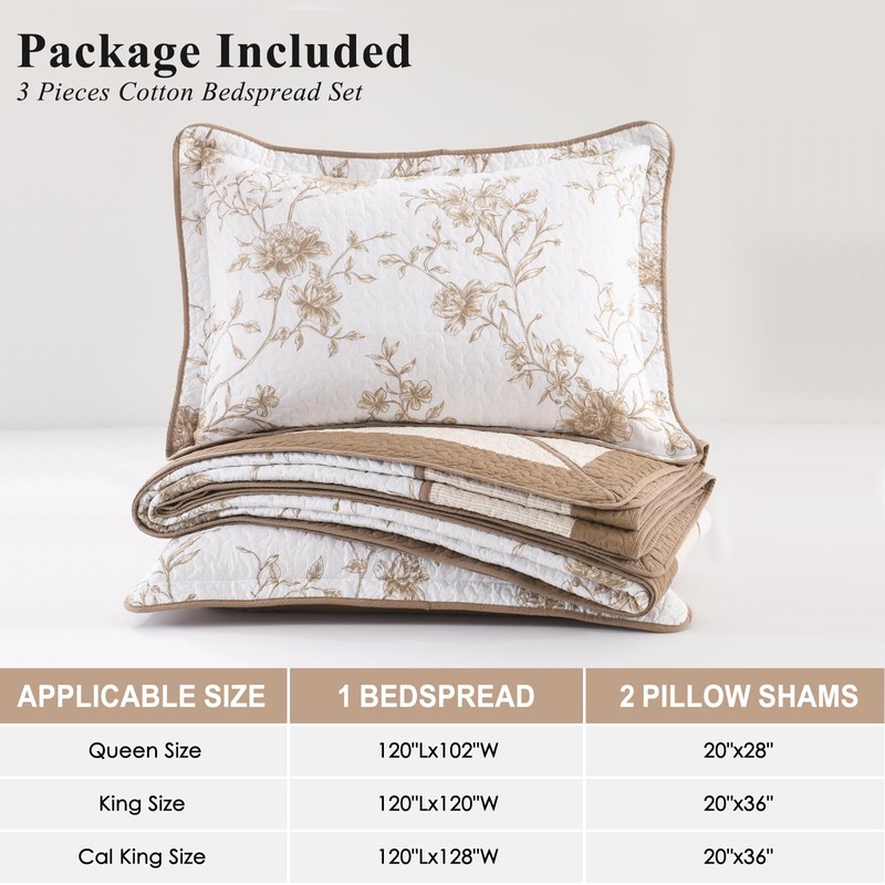 SOElinens Queen Bedspreads 102x120 - Botanical Floral Farmhouse Reversible Oversized Queen Quilt Set, 3-Piece Lightweight Thin Comforter Coverlet Set with 2 Pillow Shams, 100% Cotton, Brown/Oatmeal