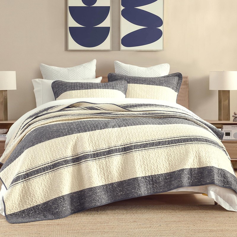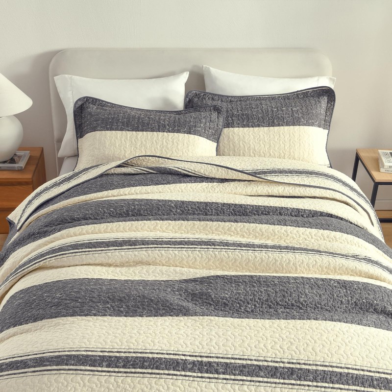 - ๐๐ข๐ฆ๐ฉ๐ฅ๐ ๐๐ญ๐ซ๐ข๐ฉ๐๐ ๐๐๐ฌ๐ข๐ ๐ง: This quilt features a simple horizontal stripe pattern, the stripe style is classic and timeless. The quilt is mainly made in a beige and dark grey colour scheme. The dark grey brings a sense of stability and elegance, making the quilt cosy without losing its style