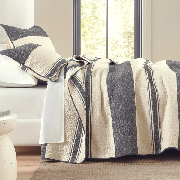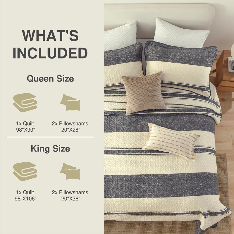 SOElinens Quilts Queen Size - 100% Cotton Charcoal Gray Off White Striped Queen Quilt Set, Lightweight Farmhouse Bedspread Coverlet Bedding Sets with Matching Shams Home Decor for All Season