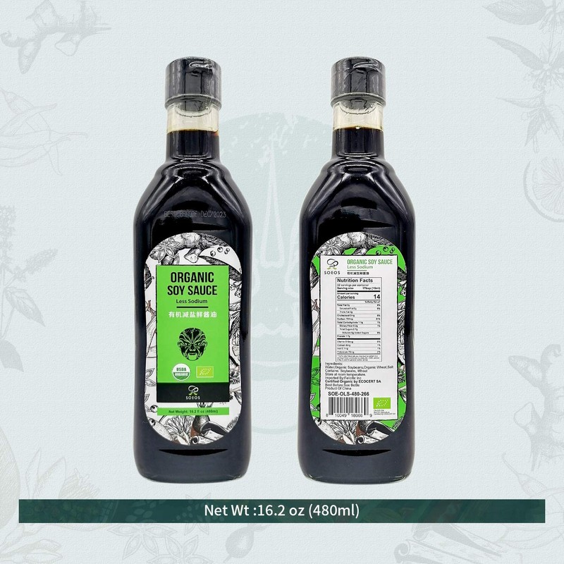 Soeos Organic Low Sodium Soy Sauce 16.2oz (480ml), USDA Organic, Naturally Brewed Soy Sauce, Soy Sauce Organic, Dark Soy Sauce, Pure Ingredients, Marinade for Meat & Vegetables., Black