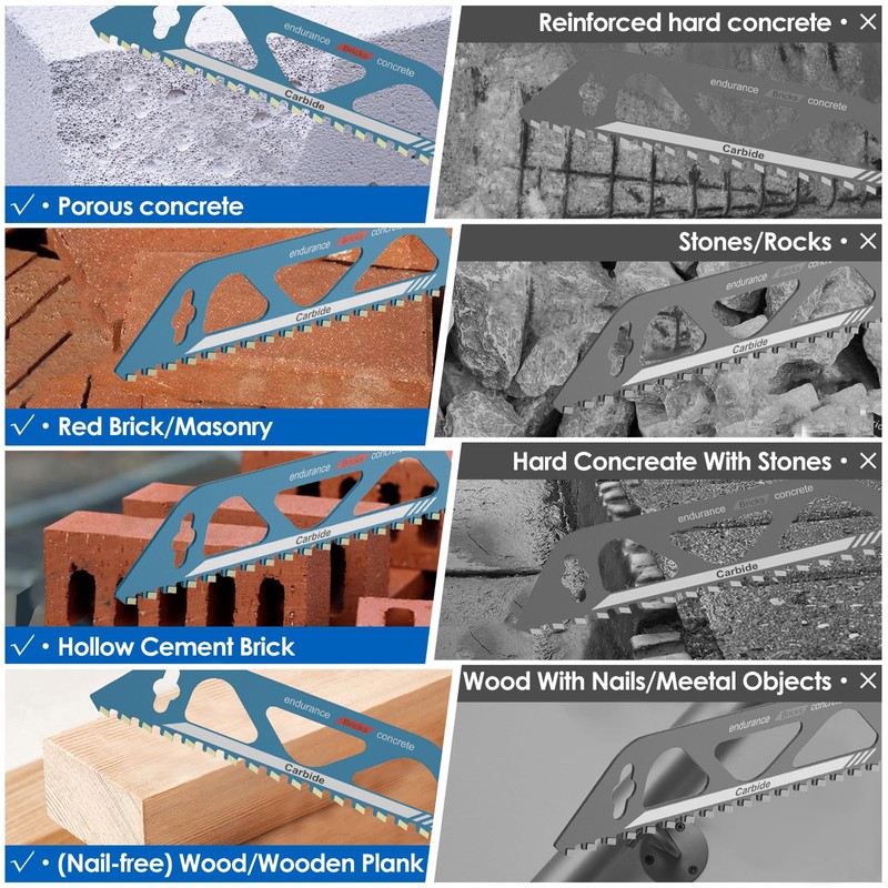 - Widely Applicable: The universal handle design is compatible with a variety of cordless saw brands. It is suitable for cutting a variety of building materials such as bricks and porous concrete. It is an ideal tool for wall cutting and door and window installation.