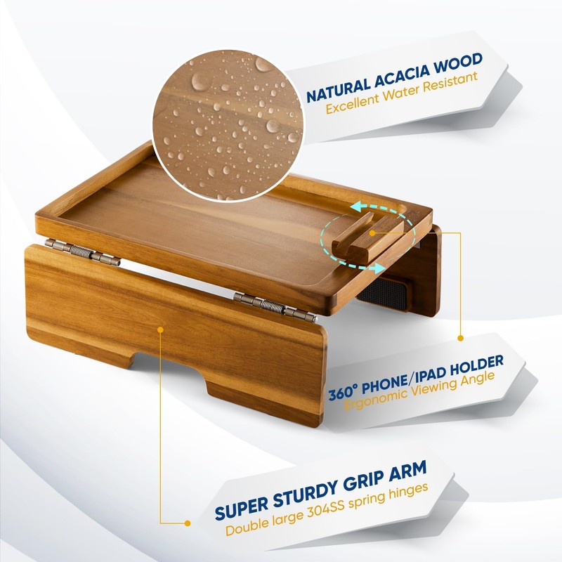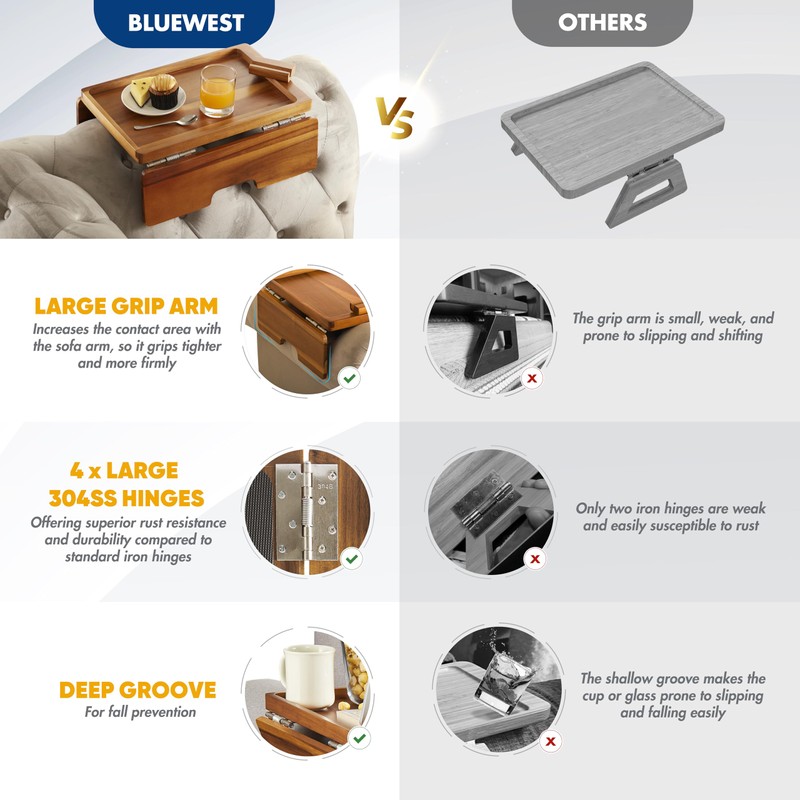 - đź”’ SUPER LARGE GRIP ARM WITH SS304 HINGES - Elevate your comfort with unmatched stability and durability, thanks to our super large grip arm and the robustness of four large SS304 stainless steel hinges. The enhanced grip arm significantly increases contact with your sofa arm for a more secure, tighter hold, while the premium SS304 hinges boast exceptional rust resistance and outperform standard iron hinges in both strength and longevity. This powerful combination not only ensures the tray stays firmly in place but also guarantees its enduring reliability and superior performance.