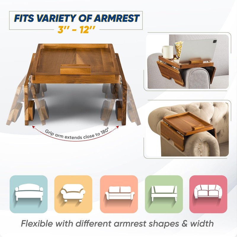 Sofa Armrest Tray, Arm Table Sofa Arm Tray with Robust Large Grip Arm, Double Large SS304 Hinges and 360 Rotating Phone Bracket, Non-Slip/Flexible with Different Sofa Armrest Shapes and Width