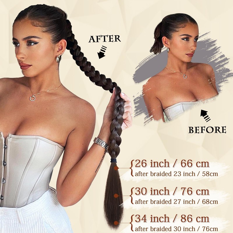 - Instant braided ponytail: the long, straight braided extensions braid with hair band is 26 inches / 66 cm long and weighs about 140 g. It is easy to wear and is attached to your own hair with a rubber band that does not fall out easily and adapts naturally when worn. Lightweight, soft and comfortable hair that can be worn all day long.