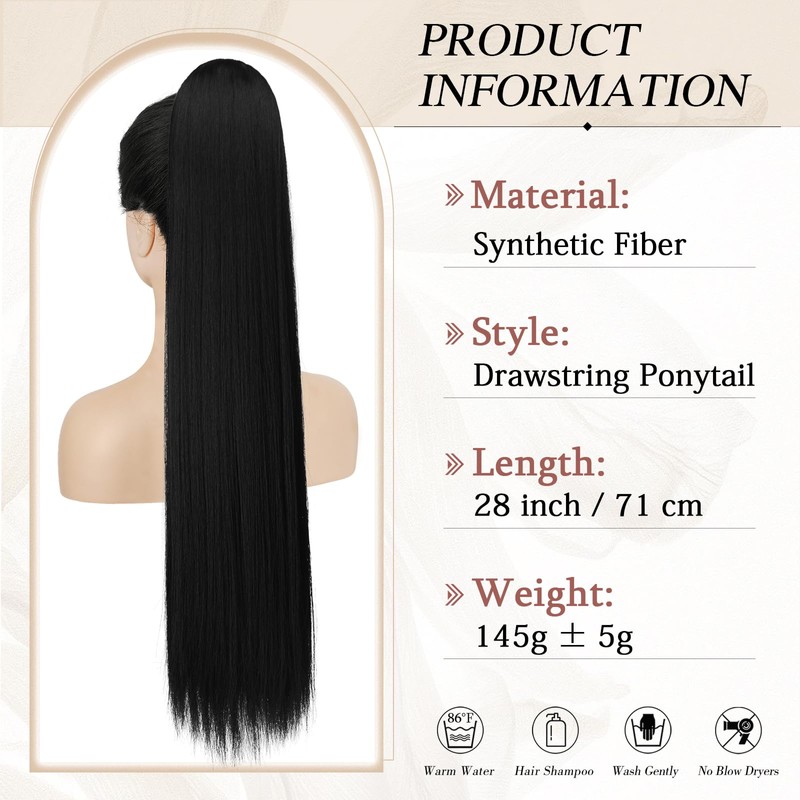 - Product design: long straight ponytail extensions with drawstring. Length: approx. 70 cm / 28 inches. Weight: approx. 145 g, comes with an elastic drawstring and 2 clips to ensure that the ponytail hair extension is fixed in place and does not slip easily; soft and breathable elastic inner mesh design makes it breathable and comfortable to wear, and will not damage your natural hair structure.