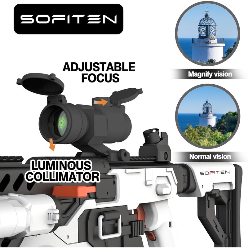 - Modular Design with Foldable Stock – Features a customizable design with removable accessories like the scope and flashlight. The foldable stock adds convenience for portability and storage, perfect for indoor or outdoor missions.