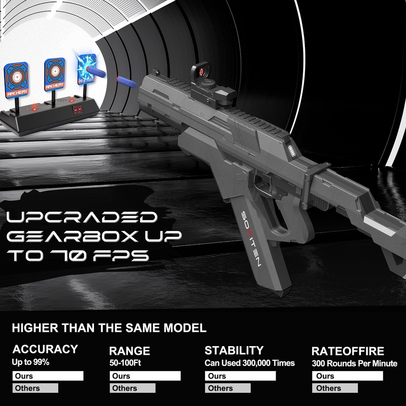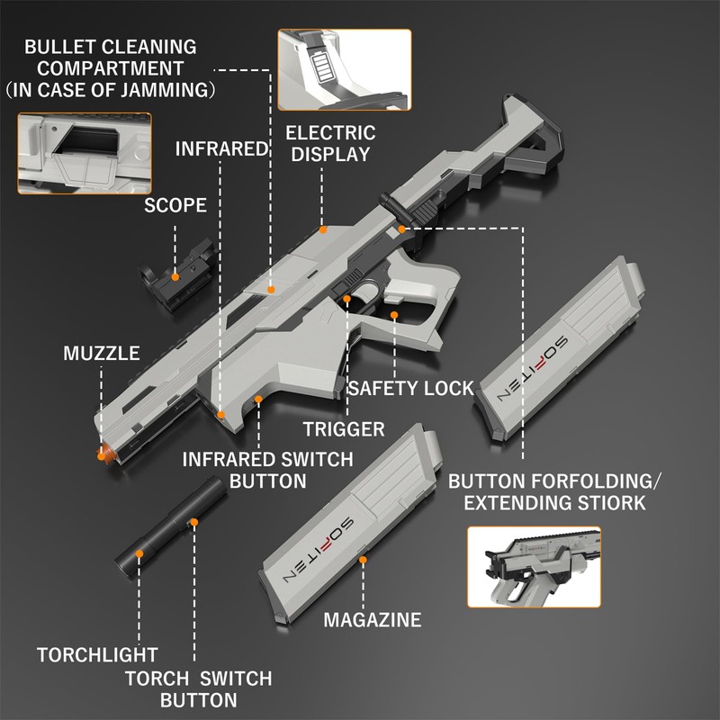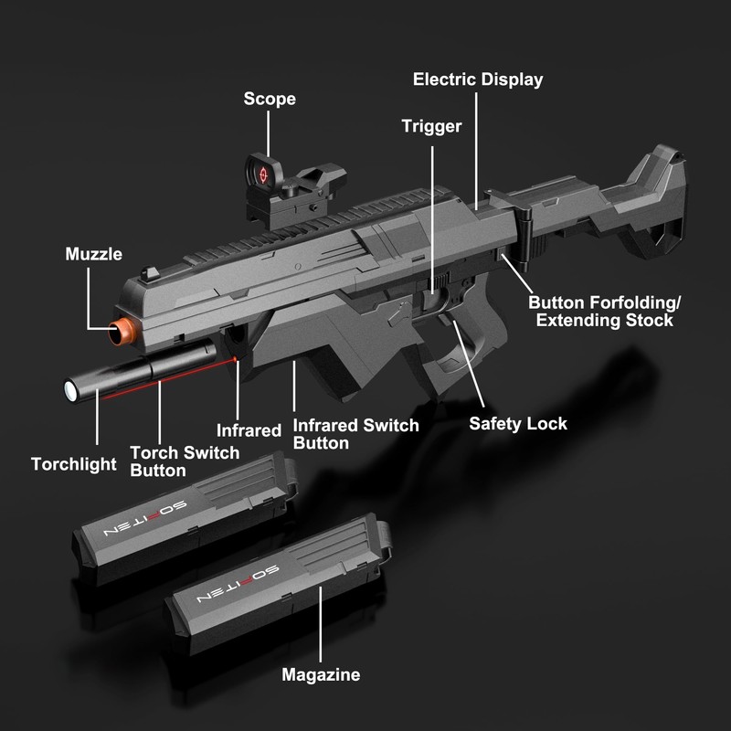 - Folding Stock Design: Quick-folding and unfolding stock design that adapts to different combat environments, enhancing portability. Whether indoors or outdoors, this toy gun offers maximum flexibility, making it perfect for any scenario.