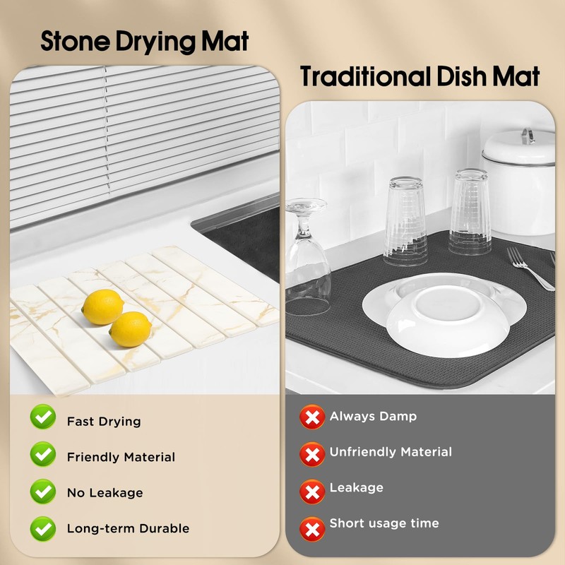 - Ultra Absorbent and Fast Dry: Stone drying mat can hold up to 150% of its weight in moisture allows water to evaporate quickly and dry faster within minute, keep your countertop clean and dry