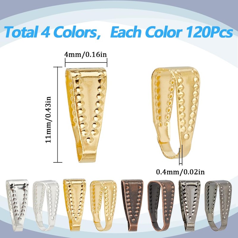 - [Size and Content]: Jewelry pinch bails are available in 4 colors, 120pcs each color, 480pcs in total. Size: about 11mm(0.43in) long, 4mm(0.16in) wide. Come with plastic box * 1pc.