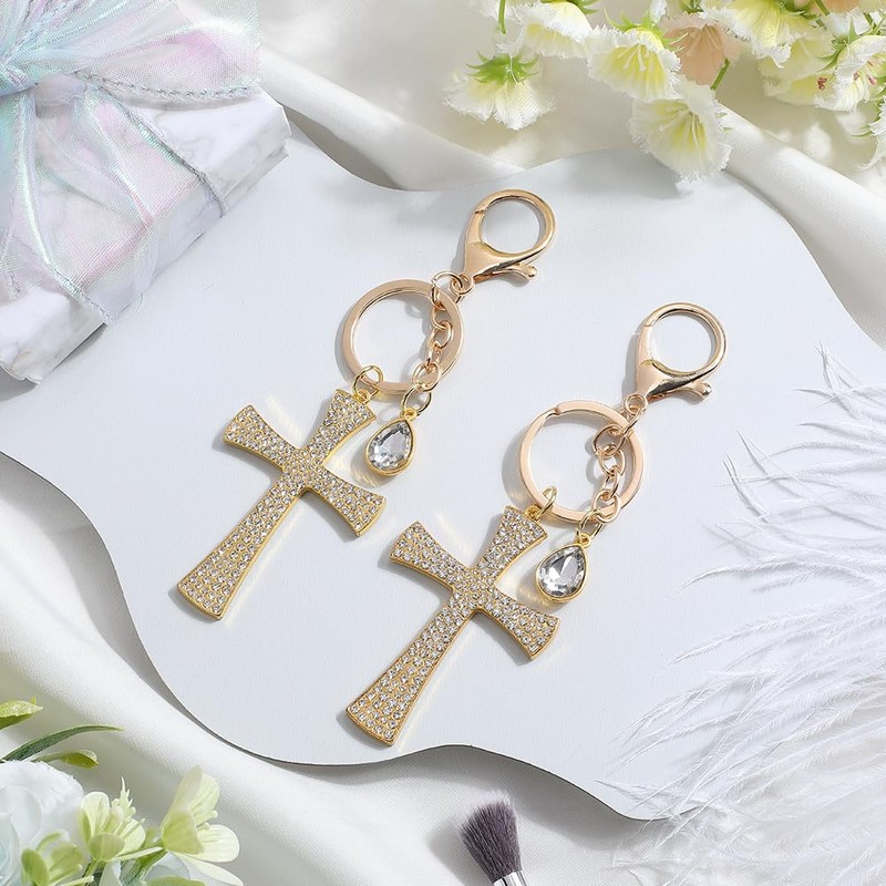 SOFPLATE 1Box 2Pcs Cross Key Chain Charm Rhinestone Cross Keychain Large Golden Alloy Crystal Clap Teardrop Blessed Holy Sparkling Cross Key Ring for Women DIY Bag Hanging Car Keys Purse Decoration