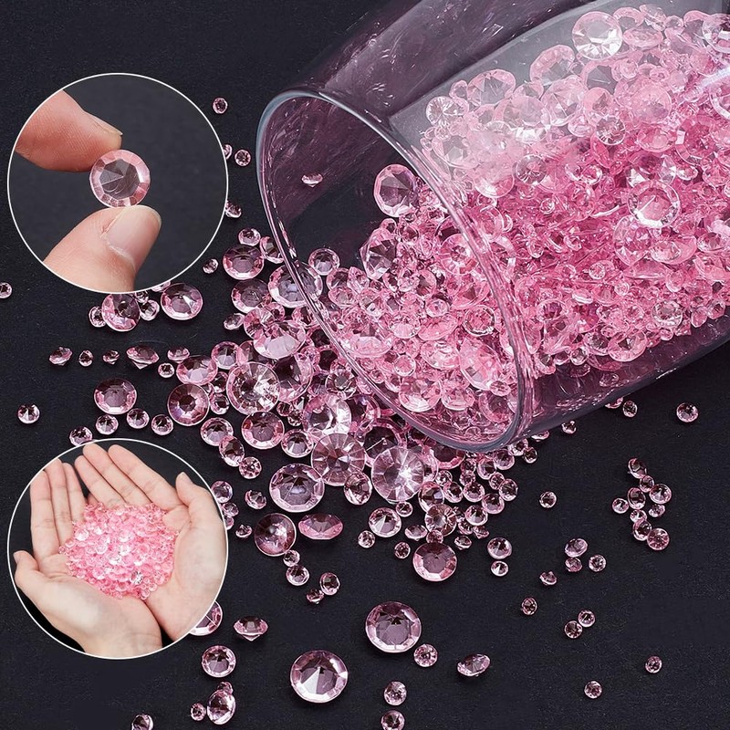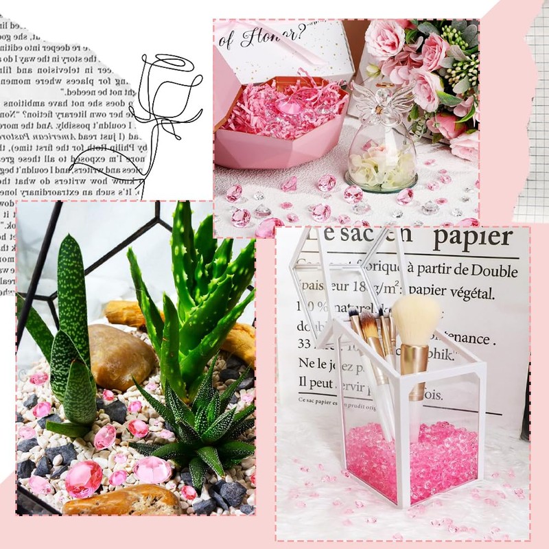 - Wide Applications: Pink acrylic gems are widely used for decorating vases, fish tanks, tables, photography props, handicrafts, and more. Suitable for decorating occasions such as weddings, parties, bedrooms, etc