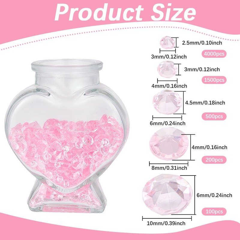 - Size and Content: Pink acrylic gems include 6300pcs about 4000pcs 3 x 2.5mm(0.12 x 0.1in); 1500pcs 4 x 3mm(0.16 x 0.12in); 500pcs 6 x 4.5mm(0.24 x 0.18in); 200pcs 8 x 4mm(0.31 x 0.16in); 100pcs 10 x 6mm(0.39 x 0.24in)