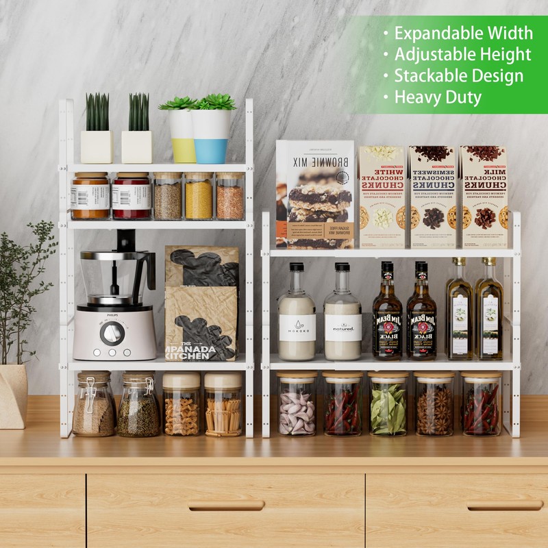 - đăStackable ShelvesăYou can stack one shelf on top of another to creat multiple levels of storage space. You can choose 1, 2 or 3 tier shelving unit to meet your needs. The shelf stand is perfect for kitchen cabinets, pantries, countertops, under the sink or anywhere you need extra space to maximize storage and organization.