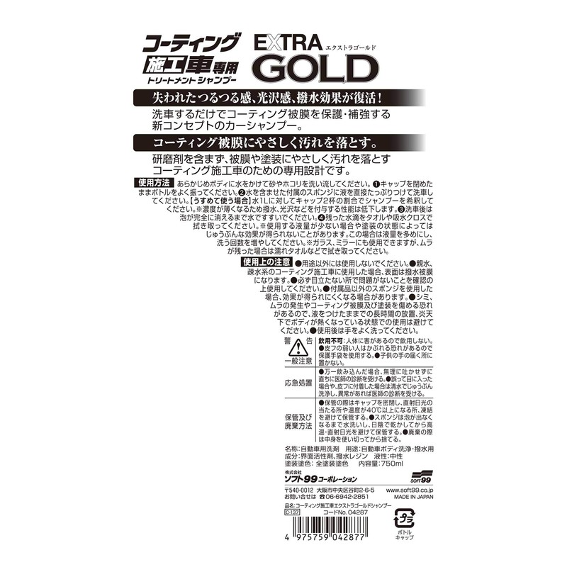 Soft 99 04287 Car Shampoo, Extra Gold Car Shampoo, 25.6 fl oz (750 ml), For Car Body Cleaning, Rich & Soft Sponge