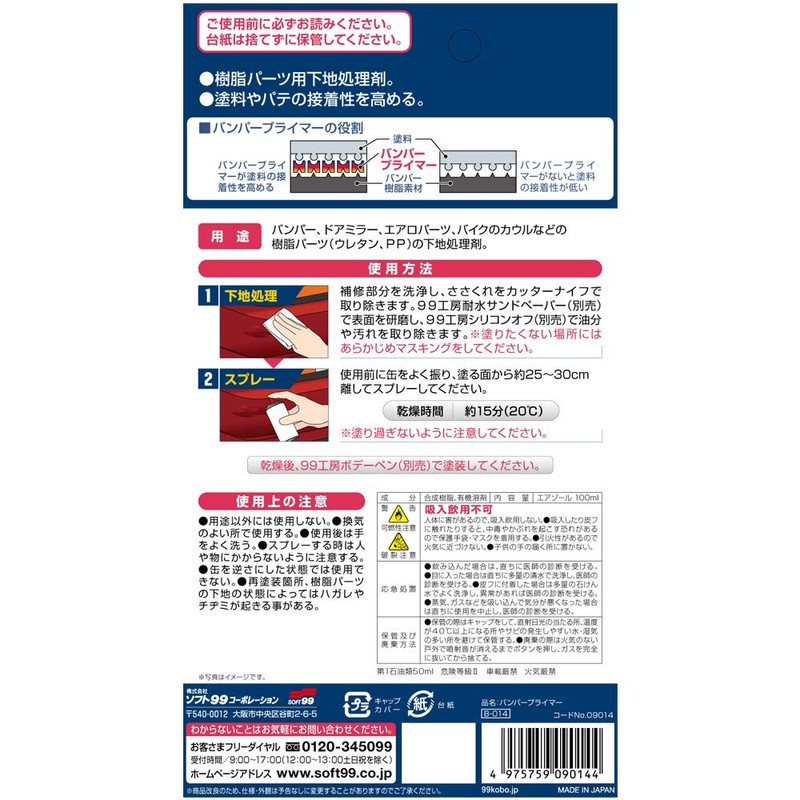 Soft 99 Kobo Repair Supplies, Bumper Primer, 3.4 fl oz (100 ml), Primer 09014 for Resin Parts (Urethane, PP) such as Bumpers, Door Mirrors, Aero Parts, Motorcycle Cowls, etc
