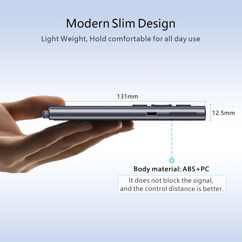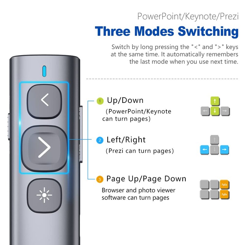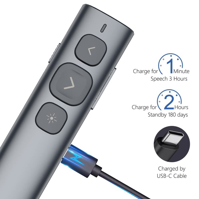 - Rechargeable - Built-in 300mAh rechargeable battery provides weeks of use on only a 2-hour charge. Long Control Range - Best choice for large-scale presentations, computer clicker range: 100M/330FT, Red light distance: 200M/656FT. Bright Red Light - This remote control presentation produces a bright red light that's easy to see against most background (Not recommended for led/ lcd/ tv screens).
