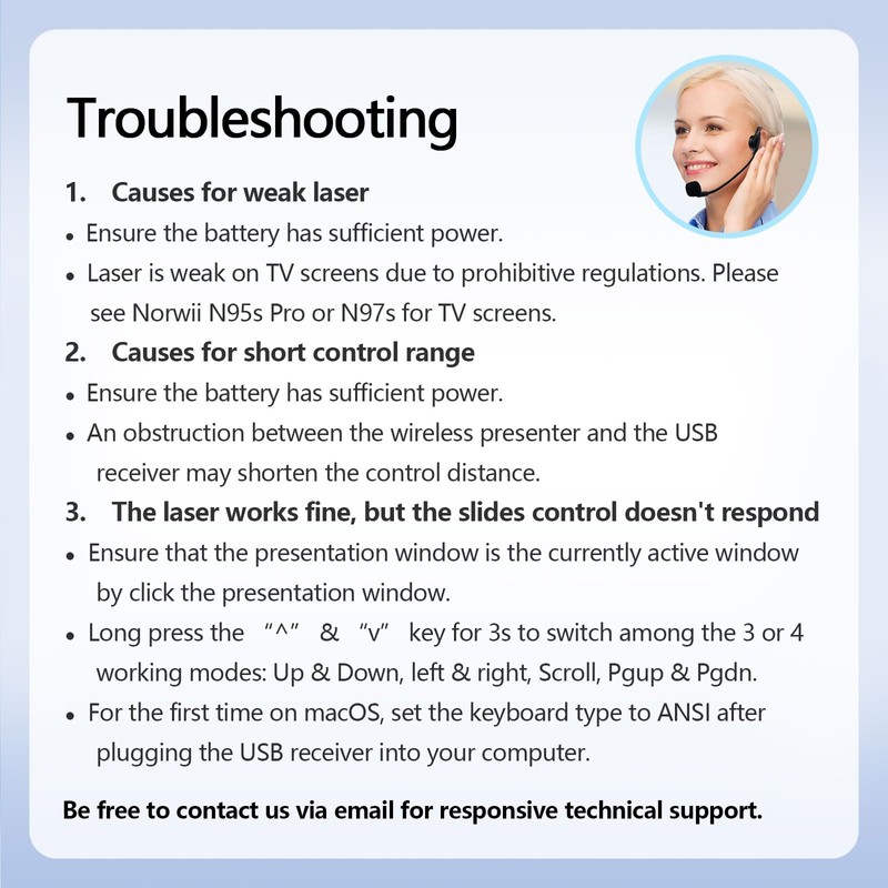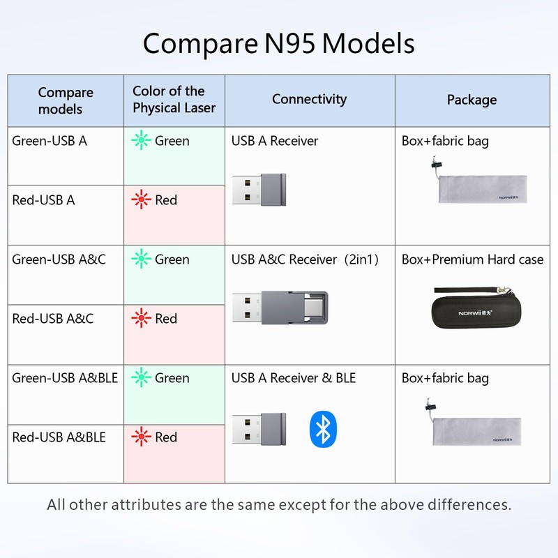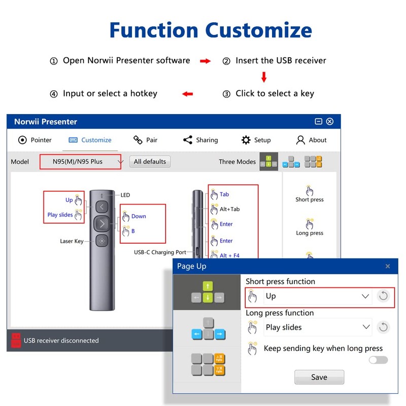 - 【What You Get】Package list: 1x Powerpoint Clicker Rechargeable, 1x USB-C Charging Cable, 1x USB-A Receiver, 1x Gift Pouch, 1x User Manual. For key-customized function, you need to find and download the software from “norwii dot com” website to achieve.