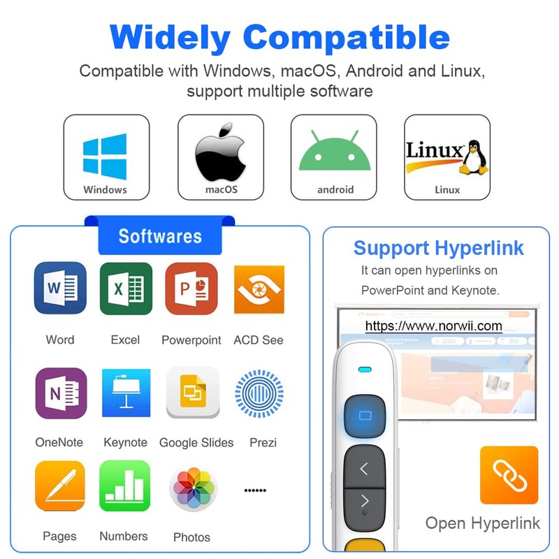 - Widely Compatible - ①Presentation clickers support operating Systems: Windows, macOS, Linux, Android; ②Powerpoint remote supports software: PowerPoint, Google Slides, Keynote, PDF, MS Word, ACD See, Website, iWork (Keynote & Numbers & Pages), Prezi etc.