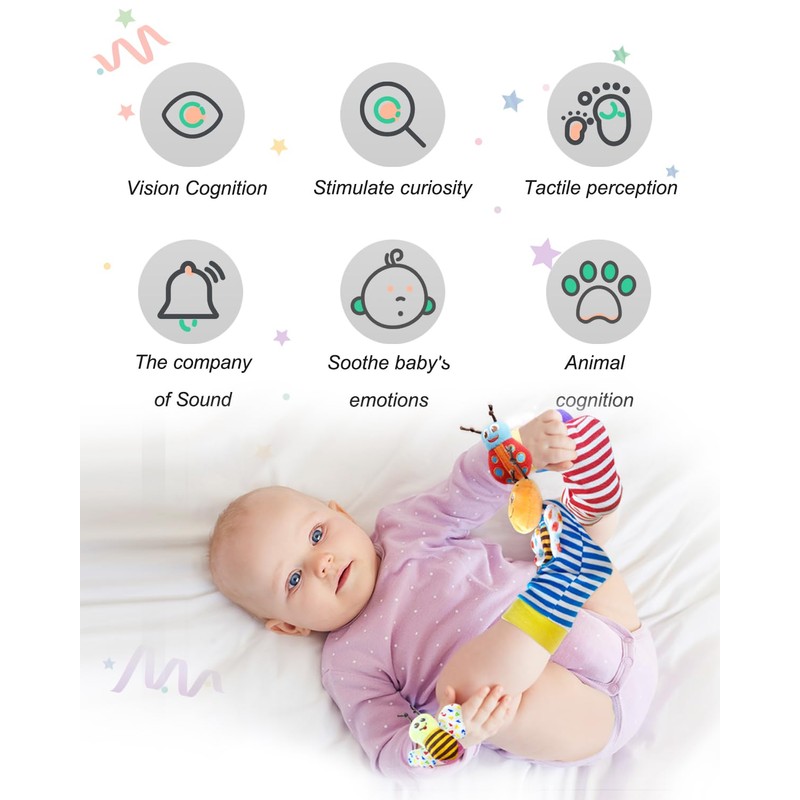 - ❤️ATTRACTIVE DESIGN: Bright colors and lovely animal patterns will entice little baby to touch, grab and look at them. All Wrist Rattles and Foot finder socks have bells inside, the Wrists rattles attach with simple Velcro, easy to put on and off.