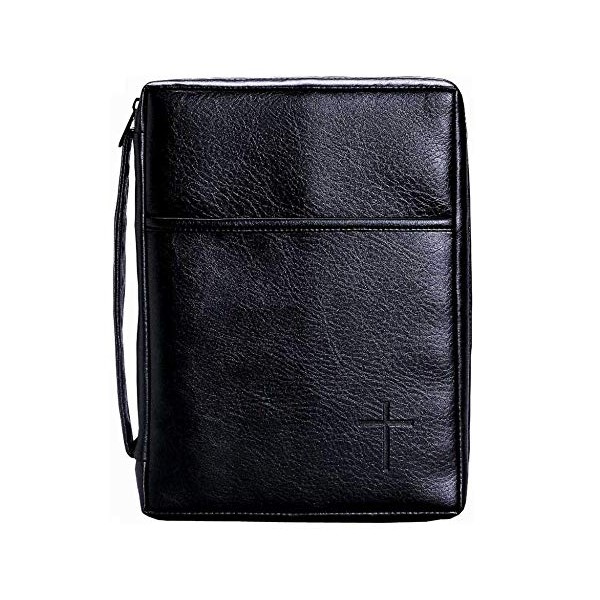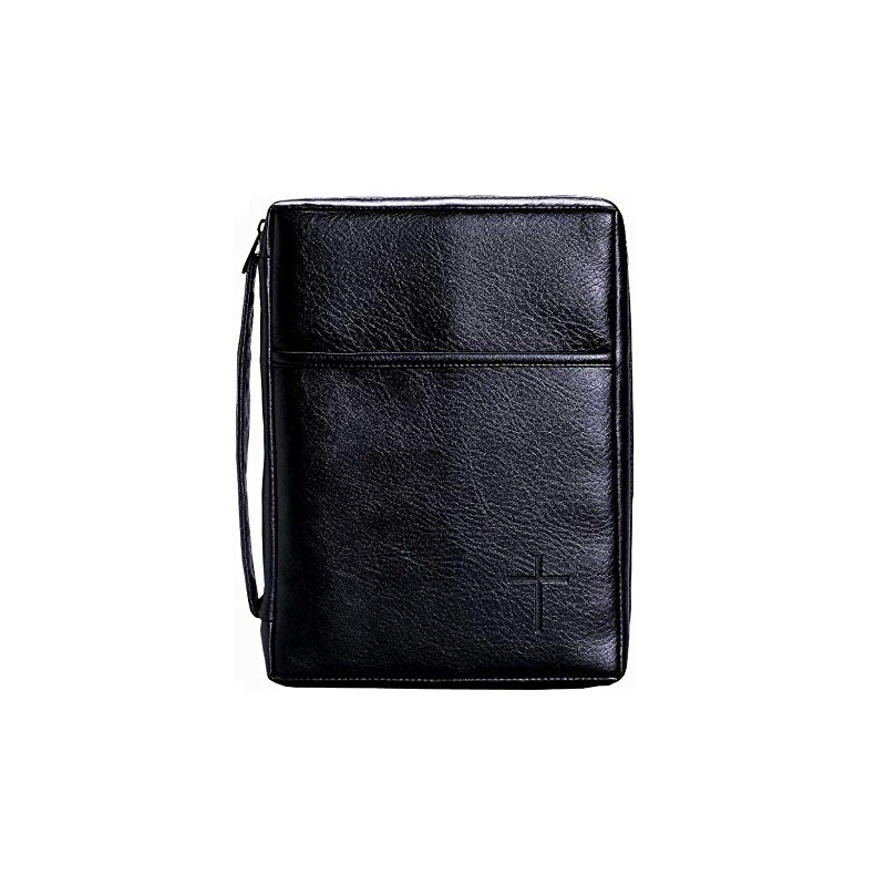 • This small Bible cover features a black stitched Cross. Includes front pocket, full zippered closure and handle.
