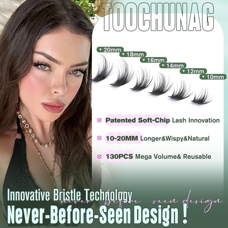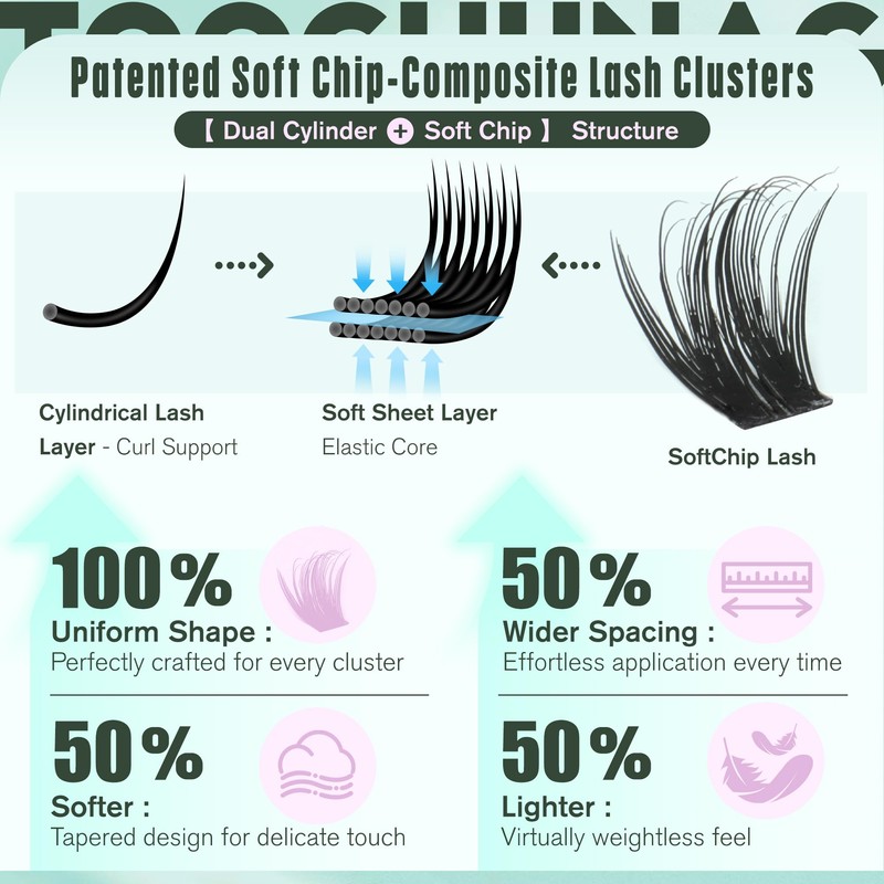 - Patented Soft-Chip Lash Clusters: TOOCHUNAG wispy lash clusters integrate a patented Soft-Chip core, blending multi-layer soft fibers for 50% lighter weight and 50% softer texture. New natural eyelash clusters merge invisibly with natural lashes, delivering comfort comparable to professional lash extensions.