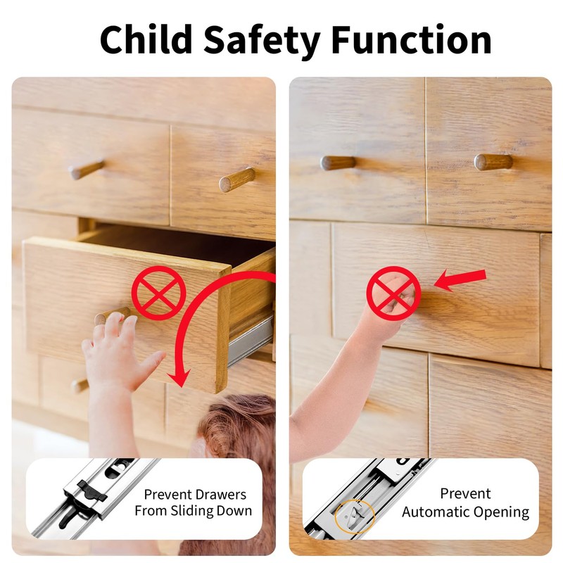 - 【Child Safety Features】The drawer slide boasts an automatic locking system to prevent the drawer from opening automatically, combined with the no-drop feature, these drawer tracks improve safety for young children even more and optimize safety for the whole family.