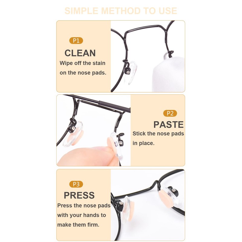 - ★ Thoroughly clean the oil and dirt off the frames. Patiently stick eyeglass nose pads, press, and hold for a few minutes to guarantee adhesion.