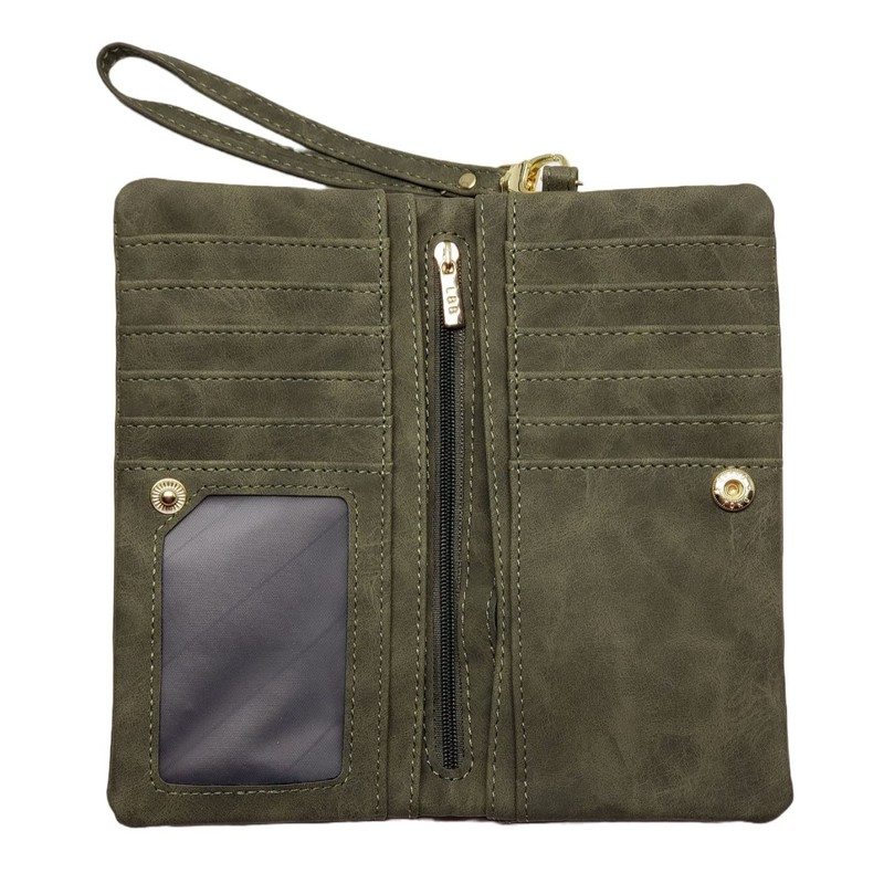 Soft Leather Long Wallet Wristlet with hand Strap Clutch Bag for Women Card holder Phone Bag (Olive Green)