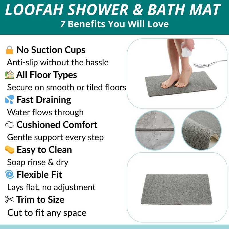 - NON-SLIP PROTECTION with a loofah bath or shower mat with a safe anti-slip rubber bottom that provides 360-degree protection and a firm grip that securely holds the mat to smooth bathroom floors bathtubs, showers, and surfaces.