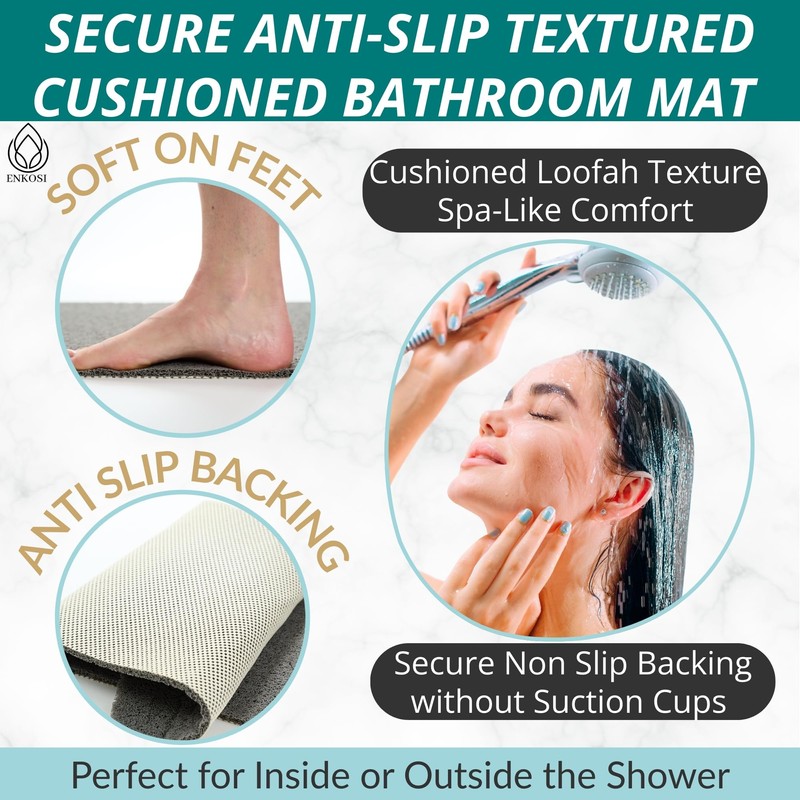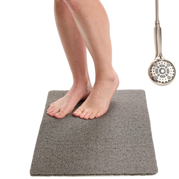 Enkosi Loofah Non Slip Shower Mat Grey – Secure Anti Slip Bath Mat - Inside or Out, Tub, Walk-in Stall, Bathtub - Floor Safety Bathroom Mats – Cushioned, PVC, Quick Dry with Drain Holes (Grey 24x16)
