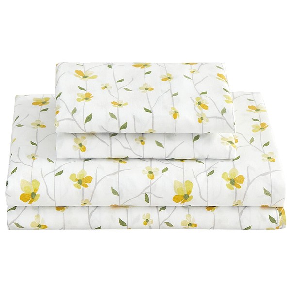 Softan Yellow Floral Sheets for Queen Size Bed Printed Bed Sheets - 4 Piece Soft Microfiber Patterned Fitted Sheets Queen with 15" Deep Pocket and Corner Straps,Cute Flower Sheets & Pillowcase Set