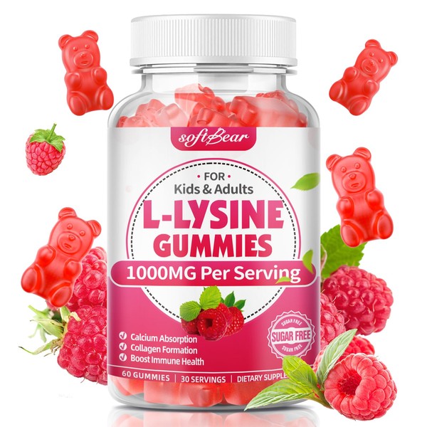 softbear L-Lysine Gummies for Adults & Kids, L Lysine 1000mg Chewable Lysine Supplement for Lips & Oral Health, Immune & Collagen Support, Vegan, Non GMO, Gluten-Free, Raspberry Flavor 60 Count