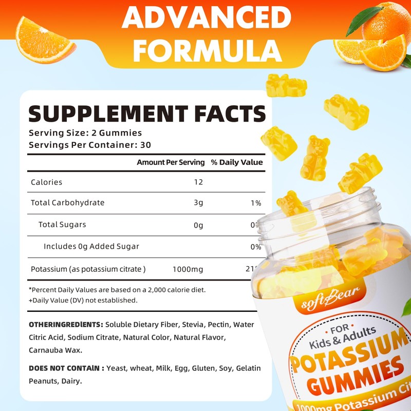 - Sugar Free Potassium Gummies: These ingredients of potassium citrate supplement are vegan, non-GMO, gluten-free, and won't increase physical burden. softbear potassium gummies are easy to chew and swallow, perfect for adults & kids, women & men