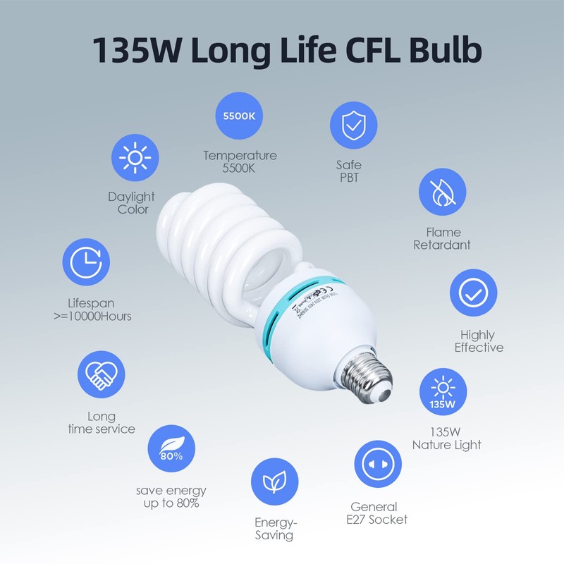 - 135W Energy Efficient Bulbs: Total output equivalent to 1350W regular incandescent light bulb, save energy up to 80% and lifetime approx 8000 hours.
